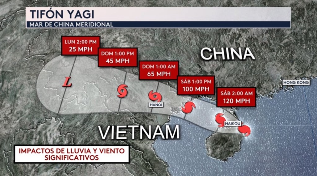 • Nos vamos para el Pacífico Occidental en el Mar de China Meridional donde el Tifón Yagi ha tocado tierra al noreste de la Isla Hainan de China como lo equivalente a un huracán de categoría 4 con vientos máximos sostenidos de 145 mph. La Península de Leizhou y Isla de Hainan verán impactos significativos de lluvia y viento en la pared de ojo de Yagi hoy. Mañana, el riesgo de lluvias torrenciales y fuertes vientos de fuerza de huracán estará presente para el norte de Vietnam
