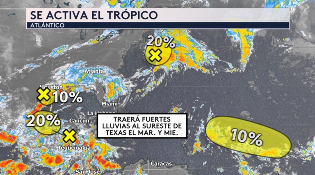 •Estamos vigilando 4 áreas en el Atlántico para el desarrollo ciclónico. Ningunos tienen más de un 20 % de probabilidad. La que está ubicada en el noroeste del golfo de Mexico con un 10 % de probabilidad es la que ha traído fuertes lluvias a la costa del golfo. La onda tropical ubicada en el oeste del mar caribe con un 20 % de probabilidad entrará al golfo de Mexico este fin de semana y independientemente de su posible desarrollo tropical, hay una alta confianza de que produzca fuertes lluvias para el sureste de Texas el martes de miércoles de la semana entrante