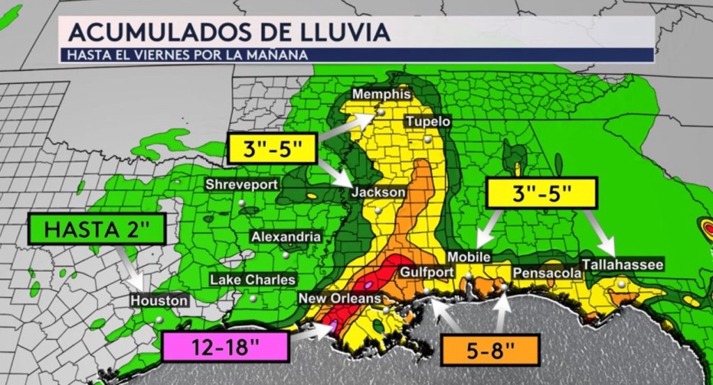 •Los acumulados de lluvia más significativos ocurrirán en el sureste de Louisiana donde 12-18” son posibles. Para el panhandle de la Florida y el estado de Mississippi, son posibles entre 3 y 8”. El este de Texas, que incluye la ciudad de Houston, puede recibir hasta 2”. Estos acumulados mostrados son válidos hasta el viernes por la mañana