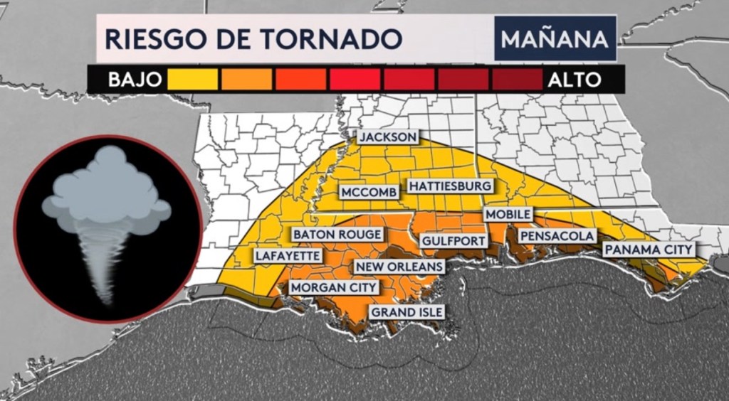•Se esperan tornados mañana al lado derecho de la tormenta para los estados de Louisiana, Mississippi, Alabama y Florida. Ciudades como New Orleans, Baton Rouge, Jackson, Mobile y Pensacola estarán bajo riesgo