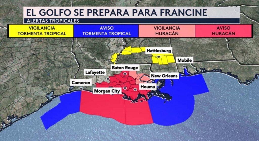 •El norte de la costa del Golfo se prepara para la llegada de Francine, donde hay alertas tropicales en vigor. Un aviso de huracán estará vigente para ciudades en Louisiana como Baton Rouge, Morgan City, Lafayette, Houma y Cameron. Aquí los vientos huracanados de más de 74 mph SE ESPERAN. En la ciudad de New Orleans, hay una vigilancia de huracán, lo que significa que los vientos huracanados SON POSIBLES. Hay un aviso de tormenta tropical para la ciudad de Mobile en Alabama y una vigilancia de tormenta tropical para la ciudad de Hattiesburg en Mississippi