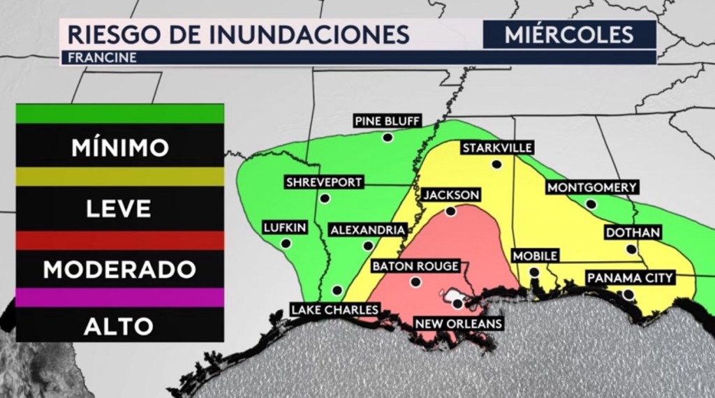 •El riesgo de inundaciones hoy debido a la llegada de las bandas de lluvia de Francine se expande desde el este de Texas hasta el norte de la Florida. Bajo un riesgo peligroso de nivel 3 de 4 en la escala de inundaciones (sombra roja) se encuentran las ciudades de New Orleans y Baton Rouge en Louisiana y Jackson en Mississippi ya que esta zona está muy saturada y no les hacen falta más lluvia