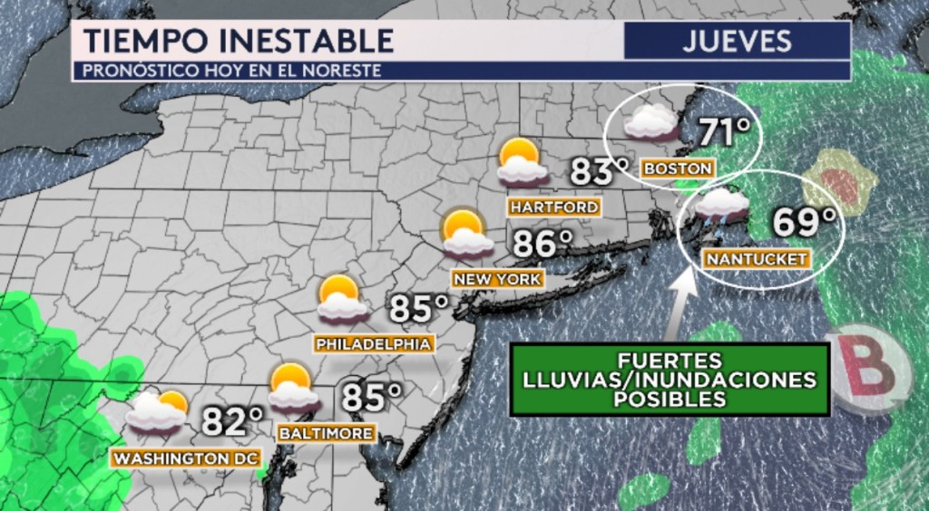 •Un sistema de baja presión fuera de la costa de Nueva Inglaterra seguirá presente hoy. Ya que ayer había lluvia en el pronóstico para muchas ciudades en el noreste como Washington, Filadelfia y Nueva York; hoy será un día más seco para ellos. Donde las lluvias y gran cobertura de nubes se concertarán hoy es hacia la costa de Massachussets que incluyen las ciudades de Nantucket, Chatham y Boston. Son posibles inundaciones con estás lluvias frecuentes circulando alrededor de la baja