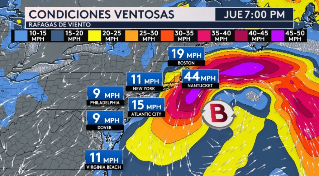 •Este sistema no solamente traerá lluvia hasta el fin de semana para este sector del país, pero también fuertes vientos hacia las regiones costeras. Las ráfagas de viento más fuertes se registrarán en la costa de Massachussets donde pudieran llegar a las 50 mph. Este flujo soplando hacia la costa pudiera causar inundaciones costeras (especialmente durante las mareas altas diarias), erosión costeras y corrientes de resaca desde Nueva Inglaterra hasta las Carolinas