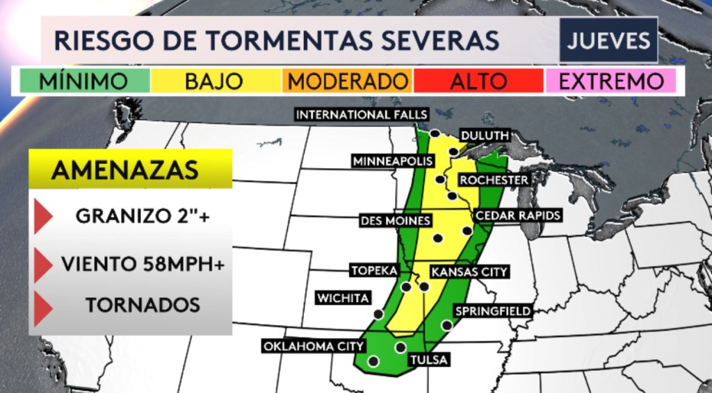 •Hay riesgo de tiempo severo esta tarde y noche por delante de un frente frío desde Texas hasta Minnesota. Ciudades bajo un riesgo mínimo en la sombra verde son Oklahoma City, Tulsa y Wichita. Bajo un riesgo leve en la sombra amarilla (nivel 2 de 5) son las ciudades de Kansas City, Topeka, Des Moines y Minneapolis. Las amenazas principales serán granizo significativo de más de 2” en diámetro, vientos dañinos de más de 58 mph y tornados