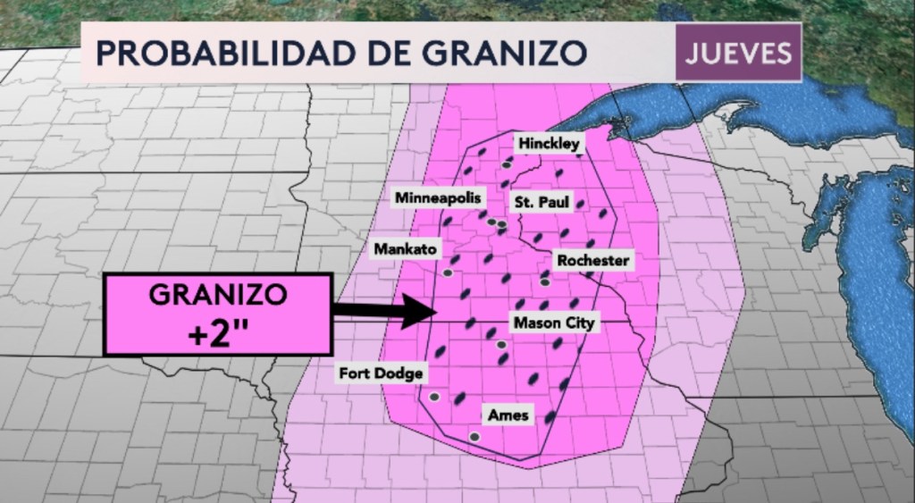 •Los estados de Minnesota, Wisconsin y Iowa serán posiblemente afectados hoy por el granizo de más de 2” en diámetro. Ciudades bajo este riesgo son Minneapolis, St. Paul, Rochester, Mason City y Fort Dodge. Este granizo del tamaño de un huevo o limón pudiera causar daños a los autos