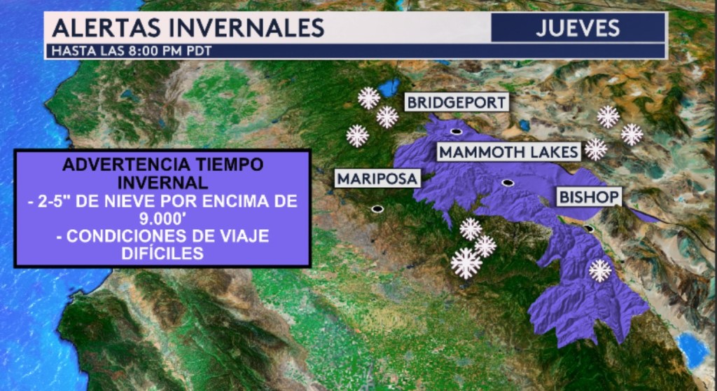•Hay una advertencia por tiempo invernal para las Montañas de Sierra Nevada en el estado de California hasta las 8:00 PM en hora del oeste. Se esperan acumulados de nieve de entre 2-5” por encima de los 9.000 pies y condiciones de viaje difíciles para ciudades como Mammoth Lakes y Bridgeport