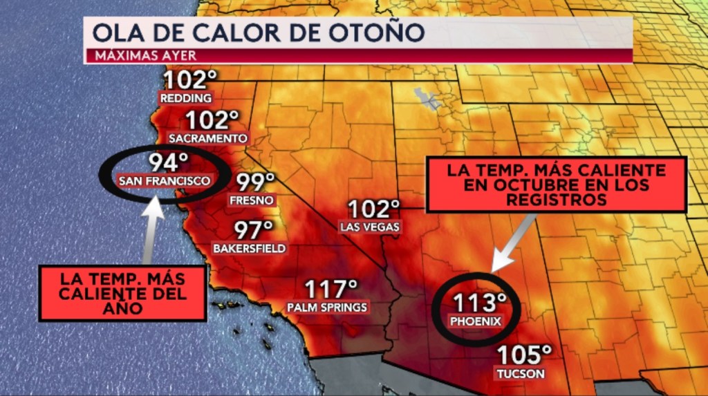 •Seguimos vigilando la ola de calor de otoño que está ocurriendo al suroeste del país. Si vemos las temperaturas máximas de ayer, 94° en San Francisco fue la temperatura más caliente del año para ellos y 113° en Phoenix fue la temperaturas más caliente en el mes de octubre en los registros. ¡Palm Springs llegó a los 117° cuando su temperatura máxima normal para la fecha es 96°!