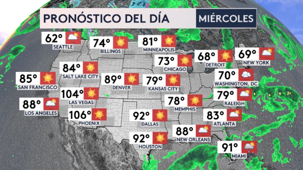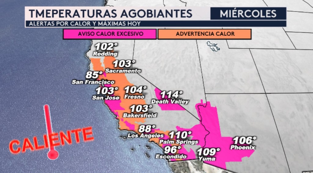 •Las temperaturas agobiantes se mantienen hoy con ciudades como San Francisco (máxima de 85°), Los Angeles (máxima de 88°), Sacramento (máxima de 103°), Phoenix (máxima de 106°) y Palm Springs (máxima de 110°) bajo alertas por calor excesivo