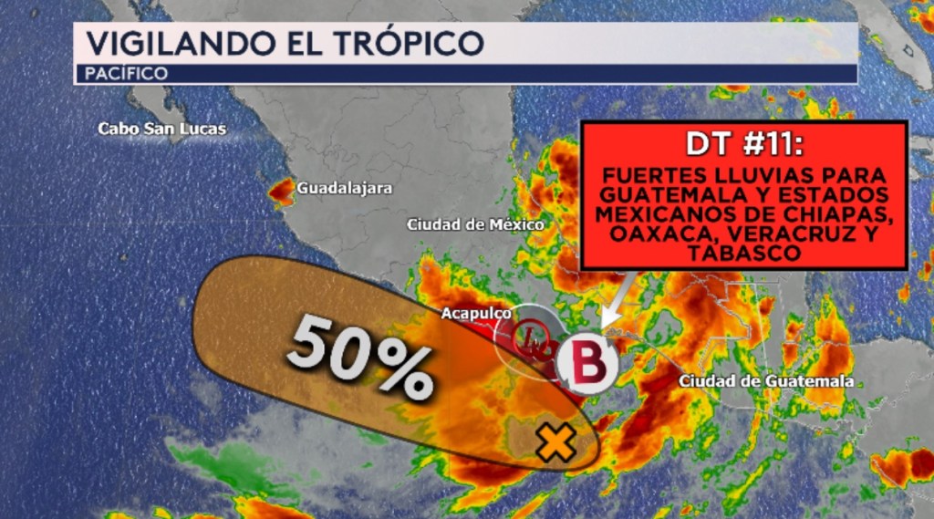 •En el Pacífico oriental, estamos vigilando dos sistemas: un disturbio con una media probabilidad (50 %) del desarrollo ciclónico a lo largo de la costa de México y la recién formada Depresión Tropical #11. Se espera que este depresión tropical traiga fuertes lluvias que pudieran provocar deslaves de tierra para el oeste de Guatemala y los estados mexicanos de Chiapas, Oaxaca, Tabasco y Veracruz. El disturbio con una media probabilidad está pronosticado producir fuertes lluvias para zonas anteriormente afectadas por las lluvias significativas del Huracán John la semana pasada