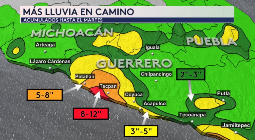 •Hay más lluvia en camino para el estado de Guerreo debido al disturbio antes mencionado que se pronostica que se mueva al oeste-noroeste a lo largo de la costa. Hasta el martes de la semana entrante, hasta 5” adicionales son posibles en Acapulco con hasta 12” al oeste de la ciudad de Tecpan y al este de Petatlán