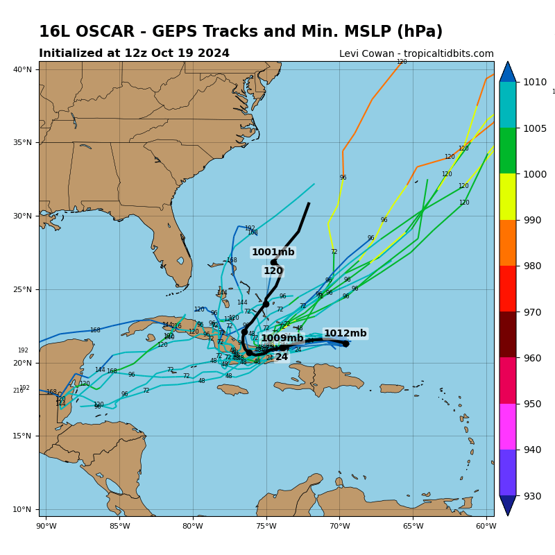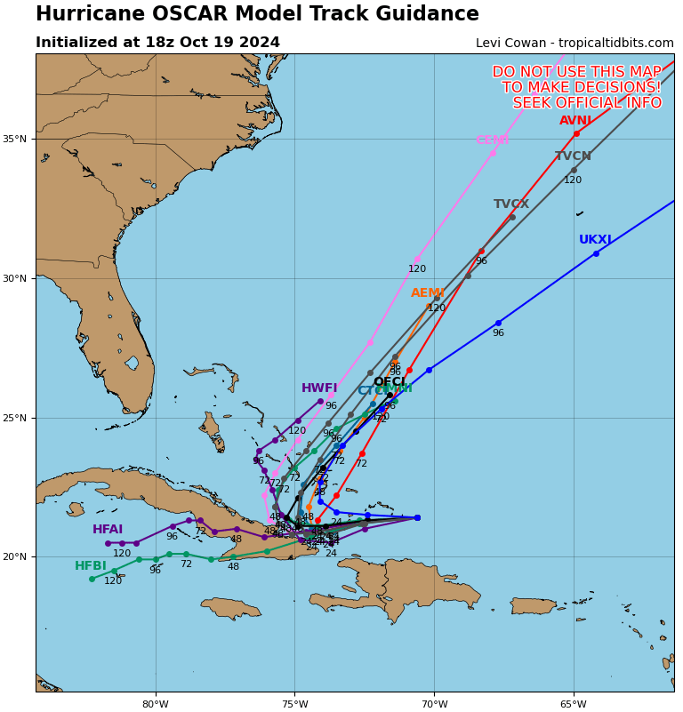 •A las dos de la tarde el centro de Oscar se localizó en los 21.4 grados de latitud Norte y los 70.6 grados de longitud Oeste, posición que lo sitúa a unos 175 kilómetros al norte de Puerto Plata, en República Dominicana y a 390 kilómetros al estenordeste de Punta de Maisí, extremo más oriental de Cuba.
