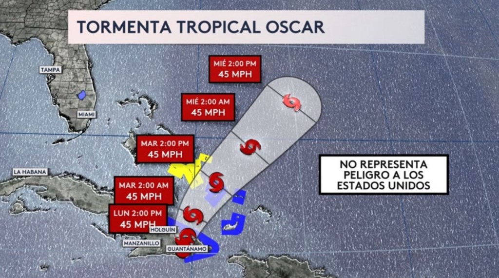 •Oscar se alejará de Cuba mañana por la mañana, llegando a las Bahamas el martes por la tarde y alejándose de esa zona el miércoles temprano por la mañana, luego entrando hacia el mar abierto del Atlántico occidental el miércoles por la tarde. Fuertes vientos en los altos niveles de la atmósfera, conocidos como la cizalladura, no permitirá que Oscar se vuelva a intensificar durante los próximos días sino que mantenga su clasificación de tormenta tropical. No representa un peligro a los Estados Unidos.