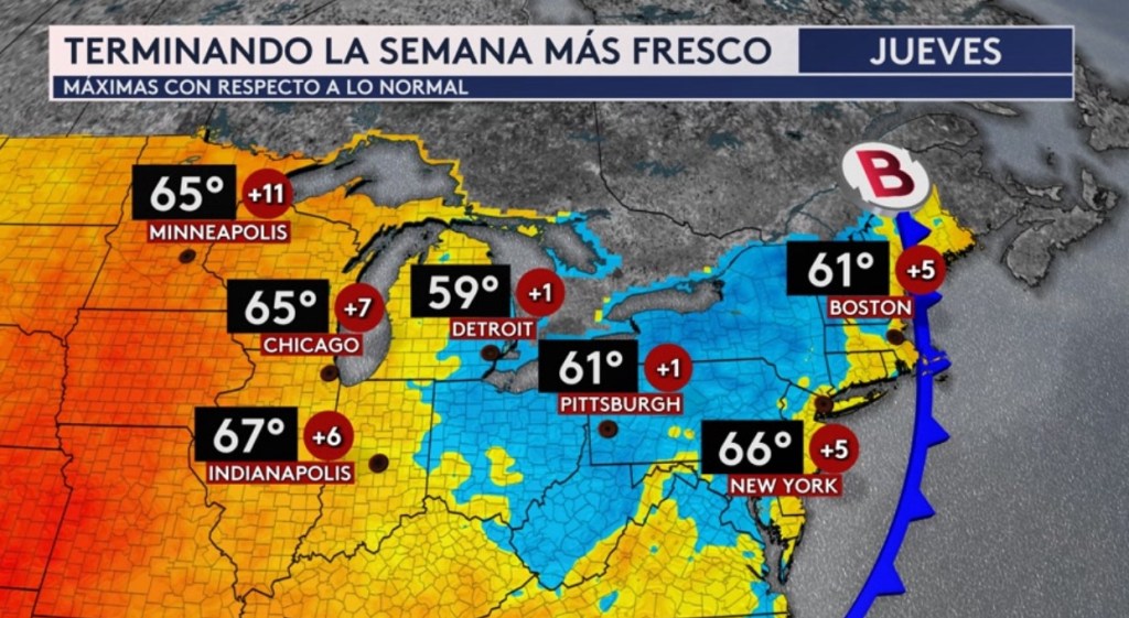 •Ahora si nos vamos para el pronóstico de los Estados Unidos, hoy el norte del país estará experimentando calor fuerte de temporada. ¡Ciudades como Minneapolis, Chicago, Indianápolis, Detroit, Nueva York y Boston tendrán temperaturas máximas entre 15 a 30° por encima del promedio! Las buenas noticias es que temperaturas más frescas llegarán para finales de semana con las máximas mostradas para el jueves. Estos valores todavía van estar por encima del promedio, pero no al nivel tan extremo como estamos viendo hoy.