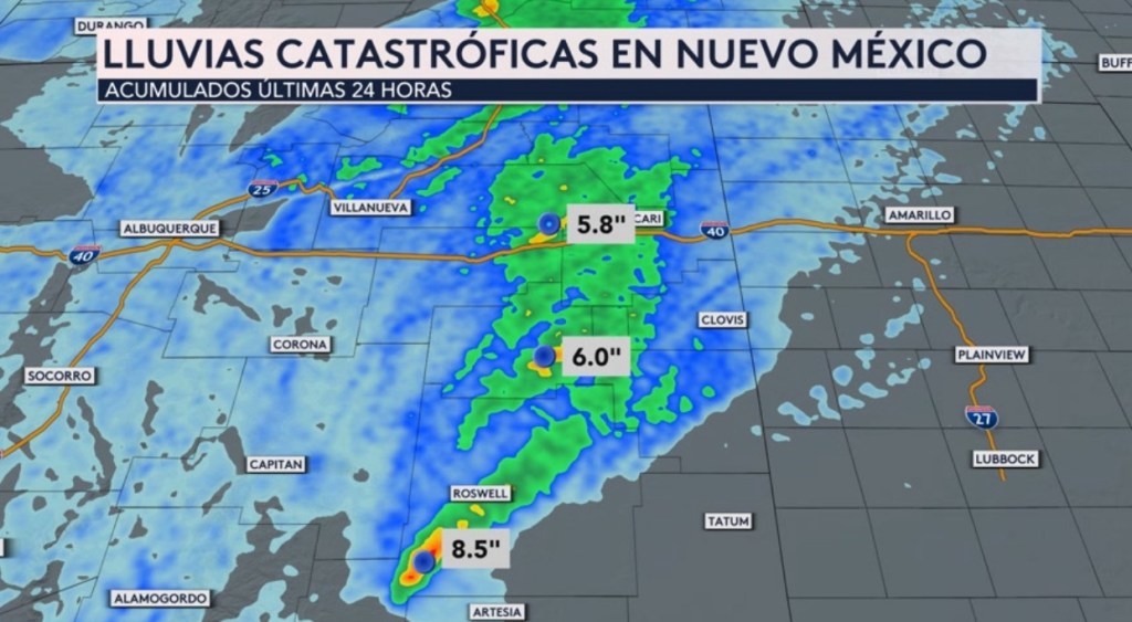 •Se registraron lluvias catastróficas el este de Nuevo Mexico este fin de semana. Al sur de la ciudad de Roswell, se acumularon más de 8”, lo que representa más de la mitad de la lluvia promedio del año. Se han confirmado dos fatalidades.