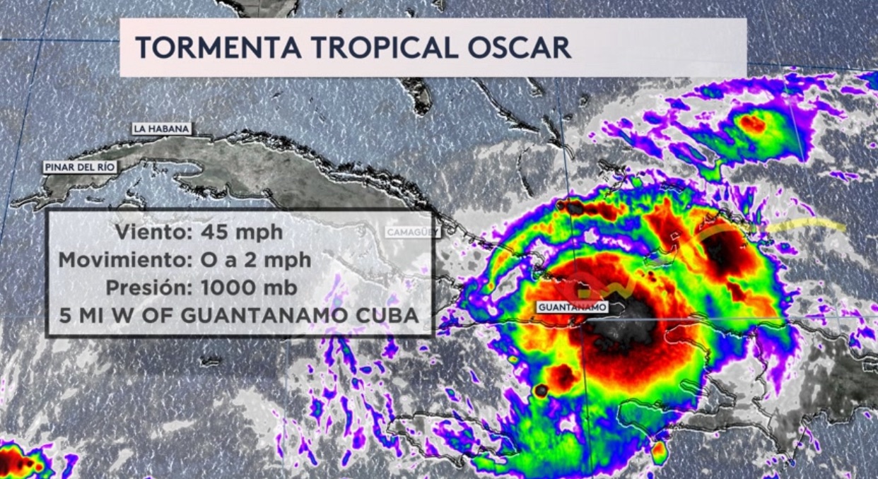 •A esta hora de la mañana, Oscar es tormenta tropical con vientos máximos sostenidos de 75 kilómetros por hora ubicada sobre el oriente de Cuba a unas 5 millas al oeste de Guantánamo. La tormenta está produciendo fuertes lluvias y deslaves de tierra alrededor de las Montañas de Sierra Maestra amenazantes a la vida al oriente del país, especialmente para las provincias de Guantánamo y Holguín. Esta fuerte y peligrosa actividad de lluvia seguirá hasta esta noche.