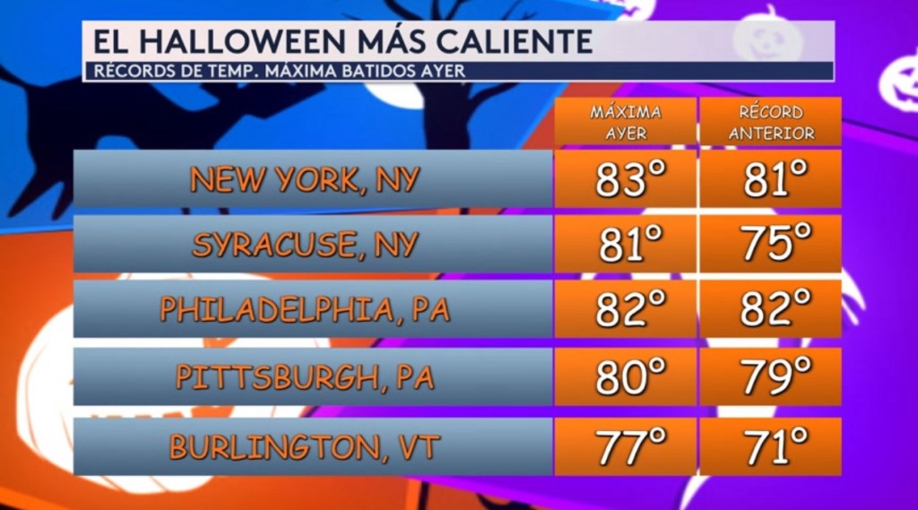 •Algunas ciudades en el noreste experimentaron el Halloween más caliente en los registros ayer. Nueva York tubo una máxima de 83°, batiendo el récord anterior de 81°. Filadelfia y Pittsburgh también batieron récords, pero ciudades como Burlington en Vermont y Syracuse en Nueva York los batieron por varios grados, demostrando la severidad de este calor fuera de temporada.