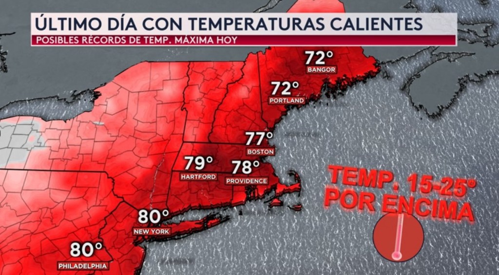 •Hoy será el último día con temperaturas calientes en el noreste. Máximas estarán en los 80° para Filadelfia y Nueva York y en los 70° para Boston, Hartford y Portland. Estos valores representan anomalías de entre 15-25° por encima del promedio.