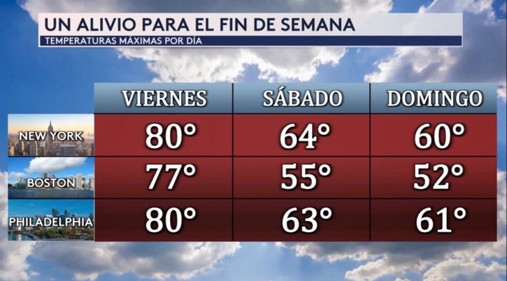 •Veremos un descenso en las temperaturas máximas para estas ciudades a partir de mañana. Nueva York y Filadelfia hoy en los 80° y en los 60° para el fin de semana y Boston en los 70° hoy y en los 50° el fin de semana.