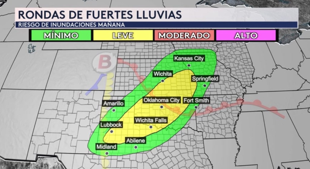 •Donde si va ver lluvia este fin de semana es sobre las planicies y el Valle de Mississippi. Para mañana un sistema frontal de baja presión en desarrollo a la ladera de sotavento de las Montañas Rocosas traerá un riesgo de inundaciones desde Texas hasta Iowa. Ciudades afectadas son Lubbock, Wichita Falls, Oklahoma City, Wichita, y Kansas City. Para el domingo, este sistema sube en latitud y trae el riesgo de fuertes lluvias e inundaciones más al norte hacia el Medio Oeste. El riesgo se extenderá desde Texas hasta Wisconsin con un mayor riesgo en la sombra roja, lo que significa un nivel 3 de 4 en la escala de inundaciones. Ciudades bajo esta amenaza son Oklahoma City y Tulsa.
