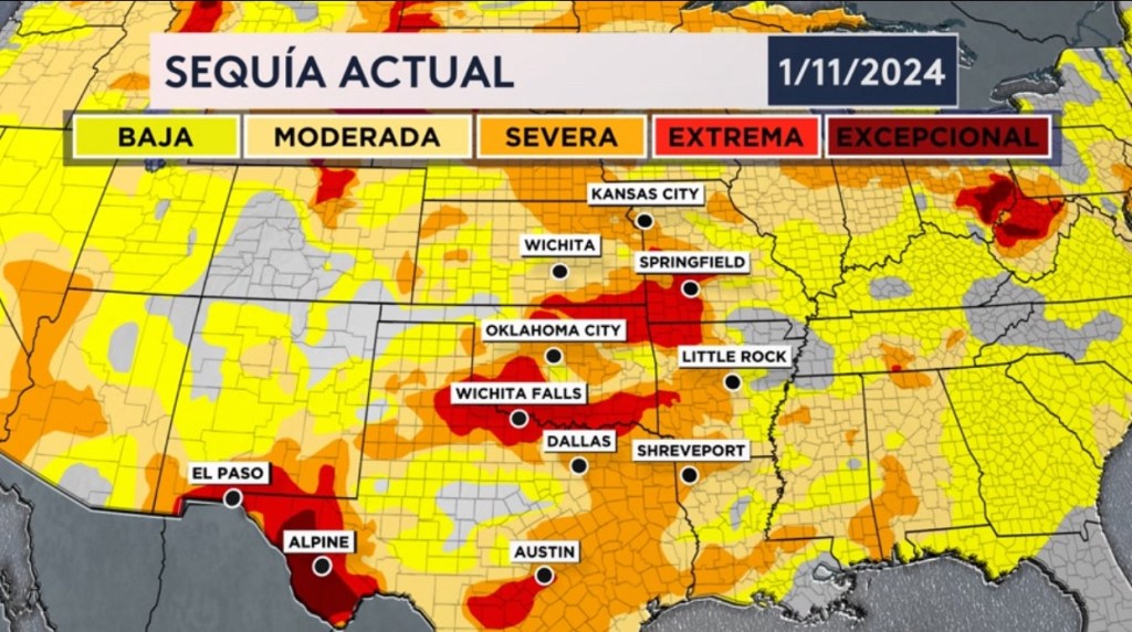 •Esta lluvia será de gran beneficio para este sector del país debido a la sequía que se está observando a través de las planicies. Se está experimentando un sequía extrema a excepcional desde Texas hasta Missouri, las cuales son los niveles más altos en la escala. Ha un déficit de lluvia, pero mucha lluvia en muy poco tiempo (lo que se está pronosticando este fin de semana) pudiera provocar inundaciones ya que el suelo está tan seco y no puede absorber toda la lluvia.