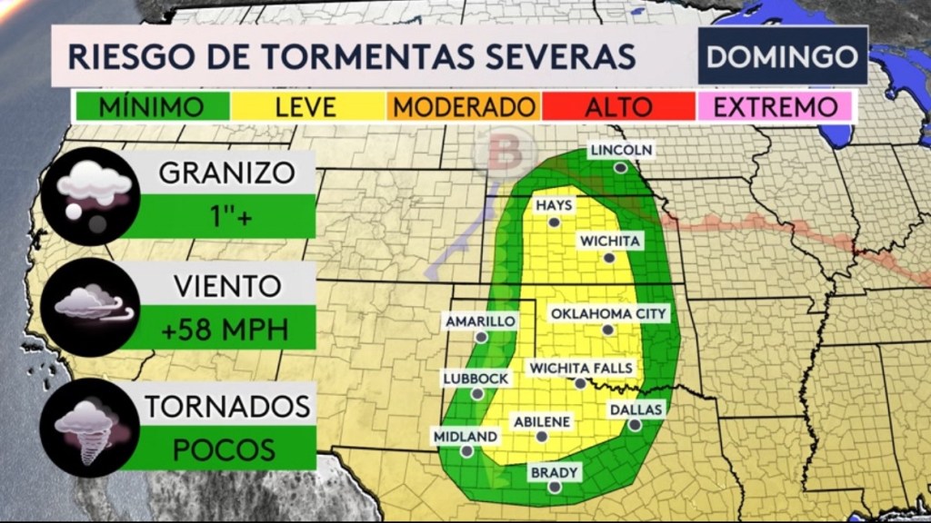 •Este mismo sistema frontal no solo traerá el riesgo de inundaciones sino también de tiempo severo. Para mañana, hay un riesgo mínimo a leve de tormentas severas para Texas, Nuevo México y Oklahoma. En Texas y Nuevo México es posible granizo dañino de más de 2 pulgadas en diámetro. En la gran zona verde, son posibles tornados y vientos dañinos. Para el domingo, la amenaza de tiempo severo se desplaza al norte, extendiéndose desde Texas hasta Nebraska. Todos los peligros severos son posibles, incluyendo tornados, granizo y vientos dañinos.