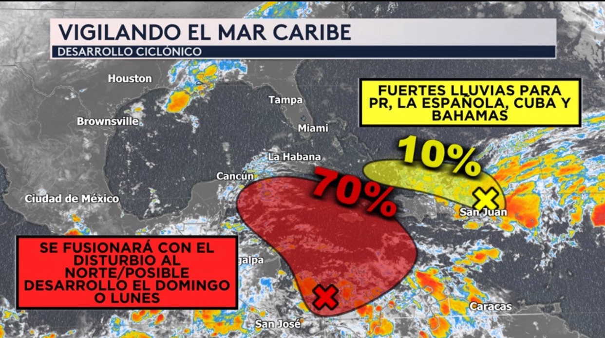 •Nos vamos para el mar caribe donde tenemos dos actualizaciones importantes. La amplia zona de baja presión que se esperaba que se formara este fin de semana ahora tiene una alta probabilidad de 70 % de convertirse en un ciclón tropical el domingo o el lunes. Al norte de Puerto Rico, se encuentra una vaguada de baja presiones que ahora tiene una probabilidad bien baja de 10 % de desarrollo ciclónico según el Centro Nacional de Huracanes.