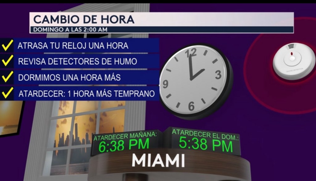 •Recuerden que este domingo a las 2:00 AM hora del este atrasaremos nuestros relojes una hora para el cambio de hora de otoño. También deben revisar los detectores de humo. Dormimos una hora más y el atardecer ocurrirá una hora más temprano. Por ejemplo, el atardecer en Miami el sábado será a las 6:38 PM y a las 5:38 PM el domingo.