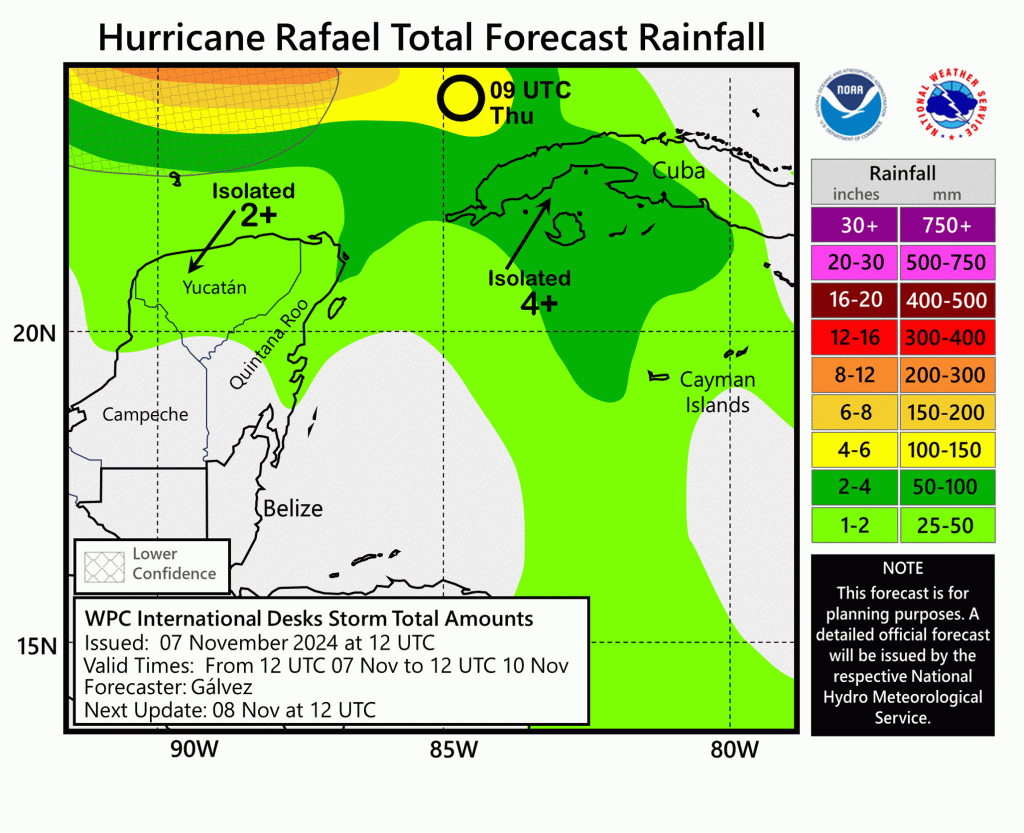 Sin embargo, los modelos muestran que si Rafael toma una trayectoria más al sur, pudiera mantener su intensidad debido a la cizalladura de viento un poco más favorable y un ambiente más húmedo. Esto lo llevará a México, pero es muy temprano en saber estos detalles debido a la alta incertidumbre que hay en los modelos de pronóstico. Una trayectoria más al norte lo debilitará mucho más rápido. Hasta el momento, Rafael no representa peligro para la costa del golfo de Estados Unidos.