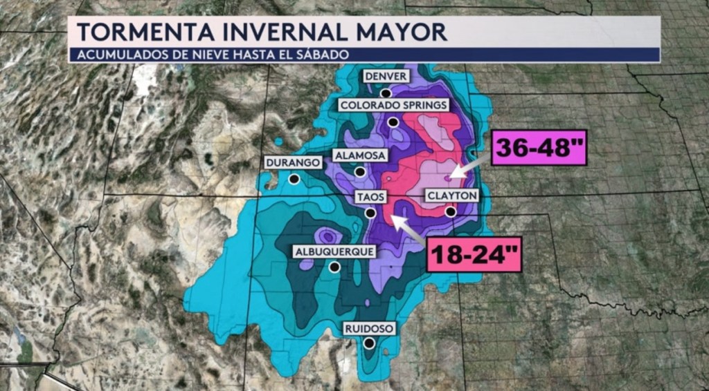 •Al oeste de ese sistema frontal que estará afectando Texas, Nuevo México, Oklahoma, Colorado y Kansas como tiempo severo y/o fuertes lluvias se esperan acumulados de nieve significativos al sur de las Montañas Rocosas. El estado de Colorado pudiera recibir hasta 4 pies de nieve y hasta 2 pies al norte del estado de Nuevo México hasta el sábado.