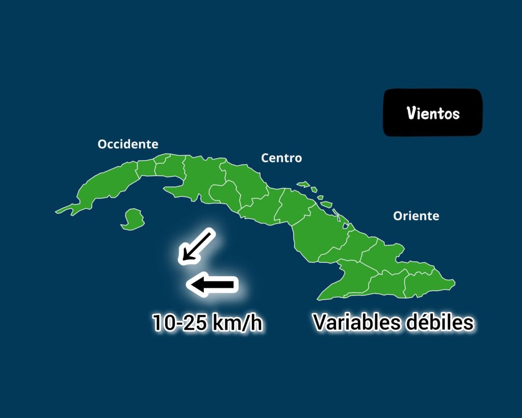 🌬️Vientos del nordeste al este con velocidades entre 10 y 25 kilómetros por hora durante gran parte del día, con rachas superiores en zonas de la costa norte. En localidades del interior de occidente, así como en la porción sur oriental serán variables y débiles.