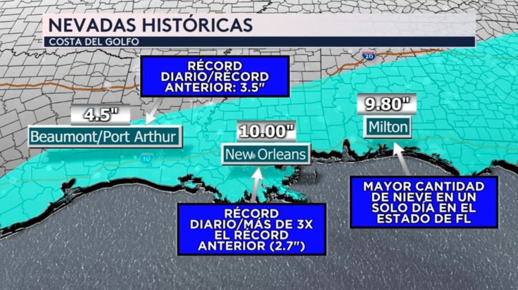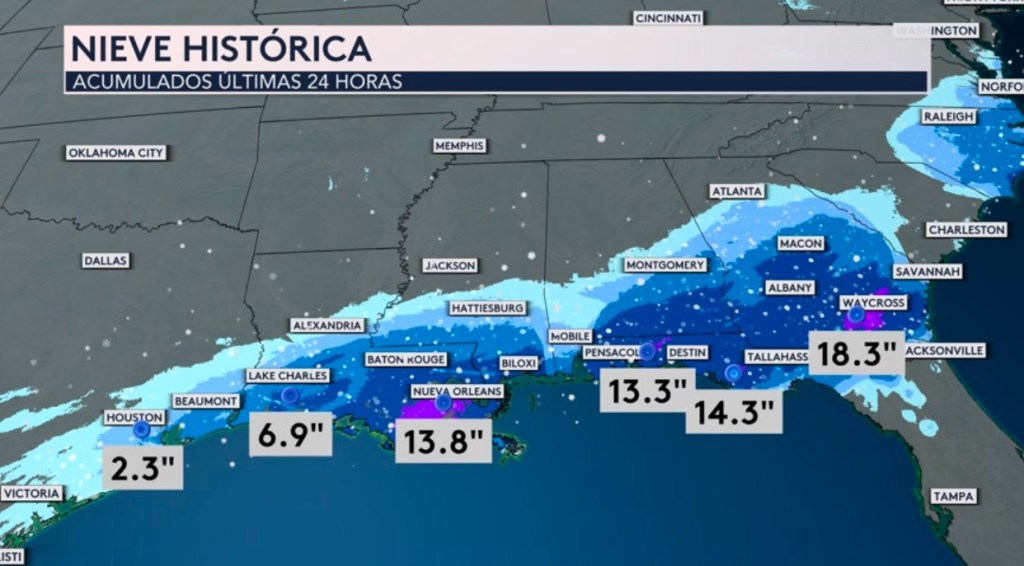 •¡Los acumulados de nieve a través de la costa del golfo de EE. UU. fueron impresionantes e históricos! Durante las últimas 24 horas, se reportan entre 1-4 pulgadas alrededor del área de Houston en Texas, 6 pulgadas al suroeste de Louisiana, más de un pie con 13 pulgadas al sur de New Orleans, también 13 pulgadas al este de Pensacola y al oeste de Destin en el panhandle de Florida, 14 pulgadas al suroeste de Tallahassee, y hasta 18 pulgaradas alrededor de la ciudad de Waycross al sureste de Georgia. ¡Impresionantes!