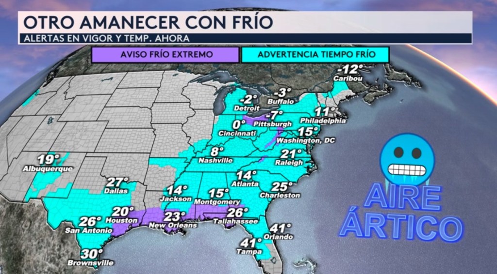 •Amanecemos con frío otra vez, con alertas por frío extremo en vigor para el sur y este del país. Las temperaturas a esta hora de la mañana están bajo cero en el área de los Grandes Lagos, el Valle de Ohio y el norte de Nueva Inglaterra. Se reportan temperaturas por debajo del punto de congelación en Houston, New Orleans, Atlanta, Washington DC, Filadelfia y Tallahassee.