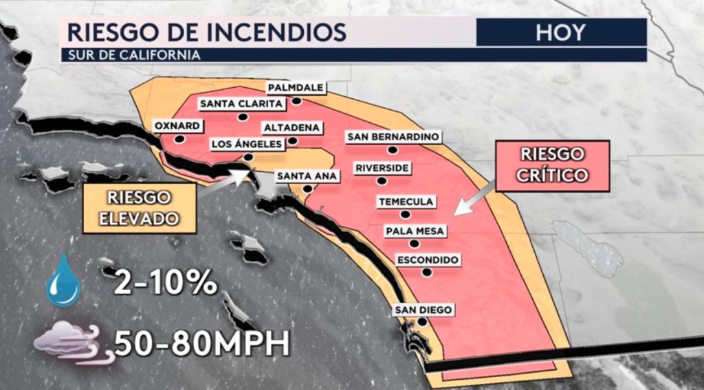 •Sigue presente el riesgo de incendios para el sur de California hoy debido a la humedad extremadamente baja y fuertes vientos de Santa Ana. Tengan en cuenta que hoy no hay un riesgo extremo (el nivel más alto en la escala de incendios) como hemos tenido en los días anteriores, pero un riesgo crítico (el nivel 2 de 3 en la escala de incendios) en el color rojo todavía require mucha atención.