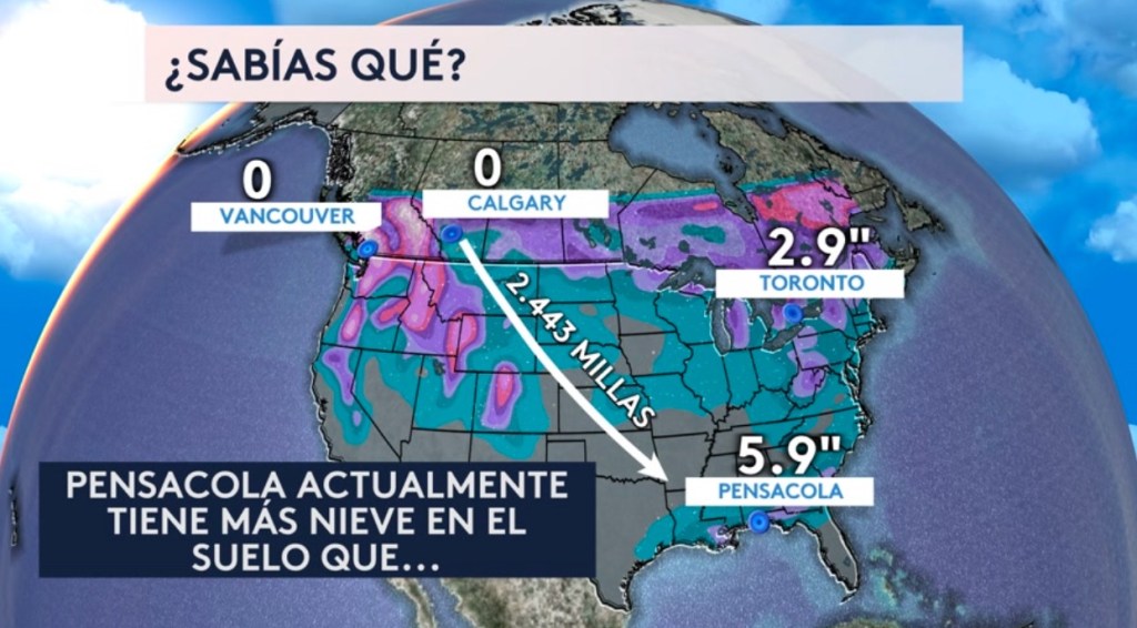 Si nos vamos más al norte, Pensacola todavia tiene más nieve en el suelo que ciudades en Canadá como Vancouver, Calgary y Toronto. ¡Desde Calgary en Canadá hasta Pensacola en Florida, se cubre una distancia de 2.443 millas!