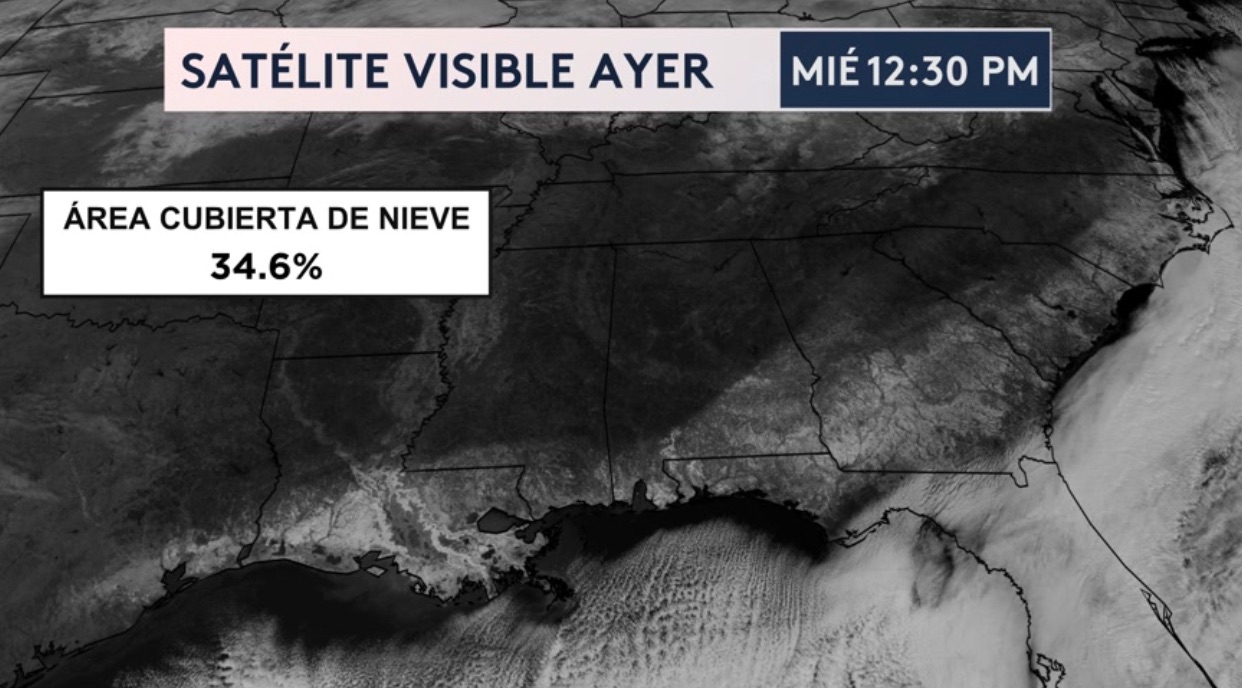 •¡Nuestra imagen visible a través del sur de Estados Unidos ayer fue impresionante! El satélite pudo observar toda la rara nieve que se acumuló a lo largo de la costa del golfo. El sur del país, válido desde ayer, está a un 34.6% cubierto de nieve. ¡La máxima profundidad de esta nieve es 11.2”, cuando el promedio para la fecha es solo 1.2”!