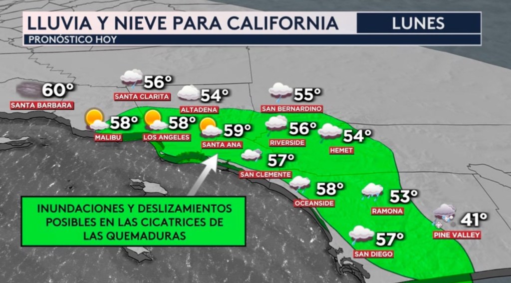 •Se espera lluvia para las valles y hacia la costa del sur de California hoy y nevadas en las montañas. Pero en la zona verde habrá la posibilidad de inundaciones y/o deslizamientos de tierra en las cicatrices de las quemaduras. Esto incluye ciudades como Los Angeles, Malibu, Altadena y Santa Clarita, las cuales fueron afectadas por los incendios Eaton, Palisades y Hughes.