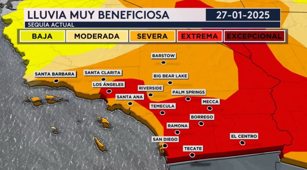 •Esta lluvia fue muy beneficiosa, no solo por los gran incendios que se observaron sino por la muy poca lluvia que han recibido en un plazo de meses. Ciudades como Los Angeles y San Diego se encuentran bajo una sequía entrena, el segundo peor nivel de sequía en la escala.