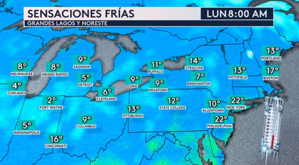 •Sobre los Grandes Lagos y noreste, se registran sensaciones térmicas frías esta mañana debido a la presencia de un fuerte sistema de baja presión al norte de la zona. Se está sintiendo como los 4° en Chicago, 8° en Milwaukee, 5° en Detroit, 13° en Pittsburgh, 11° en Buffalo, 22° en Filadelfia, 22° en Nueva York y 17° en Boston.