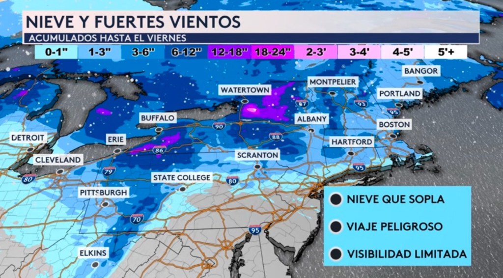 Con los fuertes vientos, algunas de estas nevadas pudieran limitar la visibilidad y causar condiciones de viaje peligrosas para los conductores. Hasta el momento, se pronostica que se acumulen hasta 3 pies de nieve al norte del estado de Nueva York a sotavento del Lago Ontario justamente al sur de la ciudad de Watertown. La otra zona de fuertes nevadas ocurrirán a sotavento del Lago Erie donde se pudieran acumular hasta 18”. Estas nevadas se mantendrán lejos de las grandes ciudades de Nueva York, Filadelfia y Washington DC.