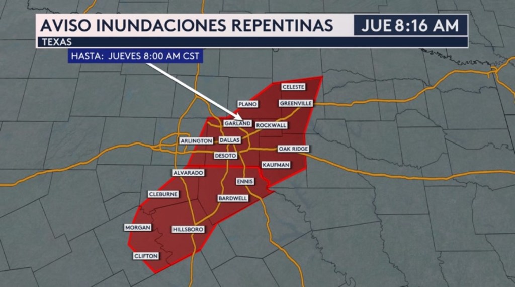 •Hay un aviso de inundaciones repentinas para la área metropolitana de Dallas en Texas esta mañana hasta las 9:00 AM hora del este o 8:00 AM hora central.