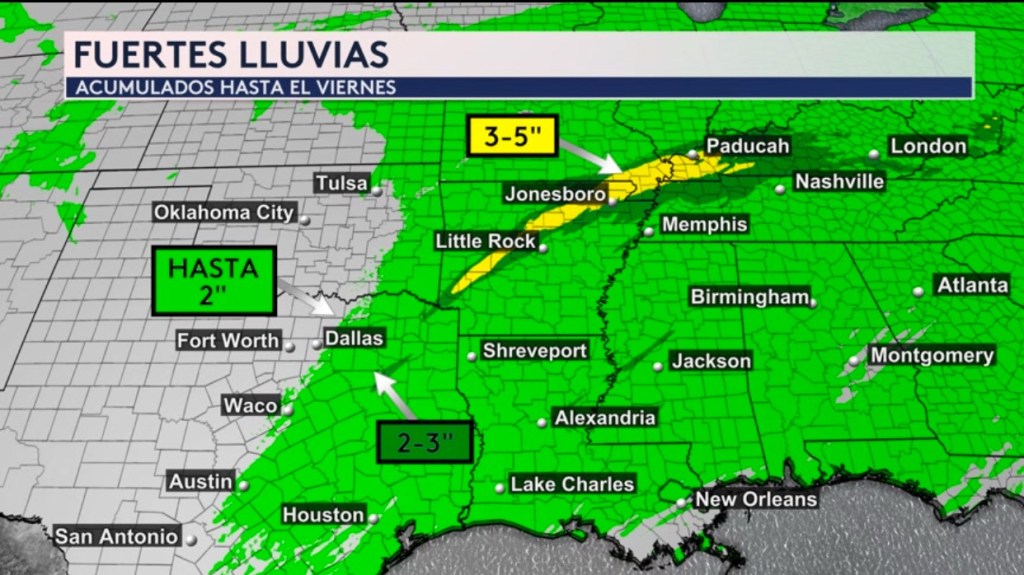 •Si vemos los acumulados de lluvia, pronostican hasta 2 pulgadas adicionales en Dallas, y hasta 3 pulgadas sobre el noreste de Texas. Más al norte y este, esperamos una zona desde Arkansas hasta Kentucky donde se pudiera acumular entre 3-5 pulgadas. Esto incluyen ciudades como Jonesboro en Arkansas y Paducah en Kentucky. Este pronóstico es válido hasta el viernes.