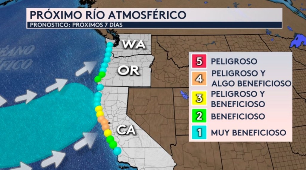 •Estamos esperando la llegada de un río atmosférico de categoría 4 para la costa oeste del país mañana. Los ríos atmosféricos son clasificados por los beneficios y peligros que traen. Categoría 4 significa que los peligros son más altos que los beneficios. La zona en que le pertenece esta categoría alta es la área de la bahía en California donde se encuentra la ciudad de San Francisco.
