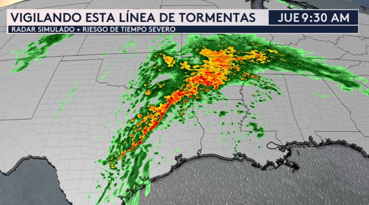 •Vemos nuestro radar simulado para ver el progreso de esta línea de tormentas durante el transcurso del día. A partir de esta tarde, ya todo la lluvia se aleja de Dallas y se aproxima a sureste de Texas y ciudades como Houston y a Louisiana, Arkansas, Mississippi y Tennessee.