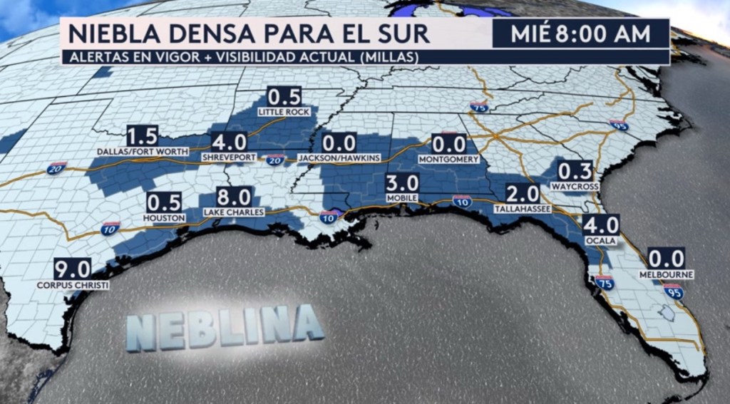 •Hay advertencias por niebla dense en vigor esta mañana no solo para Houston en Texas sino también para varias otras ciudades a través del sur del país. Estamos viendo que la visibilidad está completamente nula en las ciudades de Jackson en Mississippi y Montgomery en Alabama. Es importante conducir lentamente en estas áreas de baja visibilidad.
