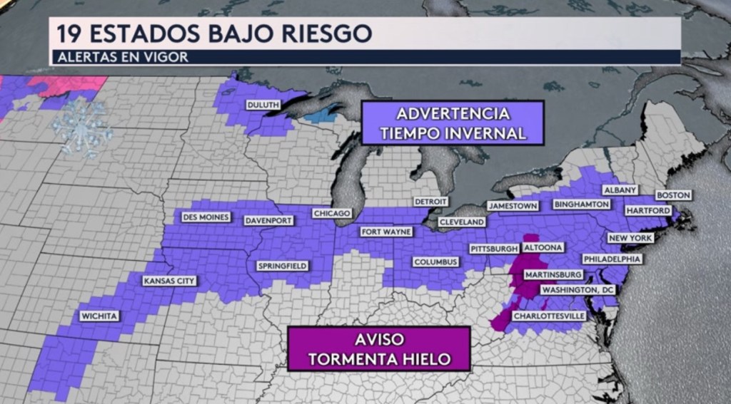 Las advertencias por tiempo invernal se extienden desde el estado de Oklahoma hasta Massachusetts y incluyen grandes ciudades como Chicago, Detroit, Cleveland, Pittsburgh, Filadelfia, Washington DC, Baltimore, Nueva York y Boston. También hay avisos por tormenta de hielo en vigor para partes de los estados de Pennsylvania, Virginia, Virginia Occidental y Maryland.