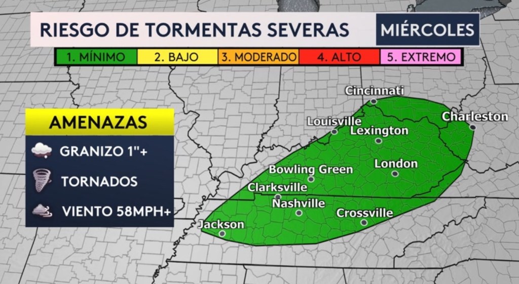 •Al sur de todo esa precipitación invernal, habrá el riesgo de tormentas severas para los estados de Kentucky, Ohio, Virginia Occidental, Indiana, y Tennessee que incluyen ciudades como Nashville, Louisville, Cincinnati y Charleston. Todas las amenazas severas serán posibles que incluyen granizo, vientos dañinos y hasta la posibilidad de algunos tornados.