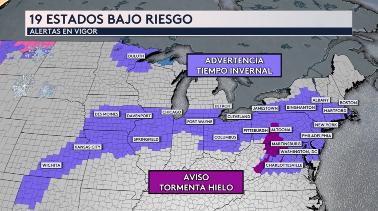 Las advertencias por tiempo invernal se extienden desde el estado de Oklahoma hasta Massachusetts y incluyen grandes ciudades como Chicago, Detroit, Cleveland, Pittsburgh, Filadelfia, Washington DC, Baltimore, Nueva York y Boston. También hay avisos por tormenta de hielo en vigor para partes de los estados de Pennsylvania, Virginia, Virginia Occidental y Maryland.