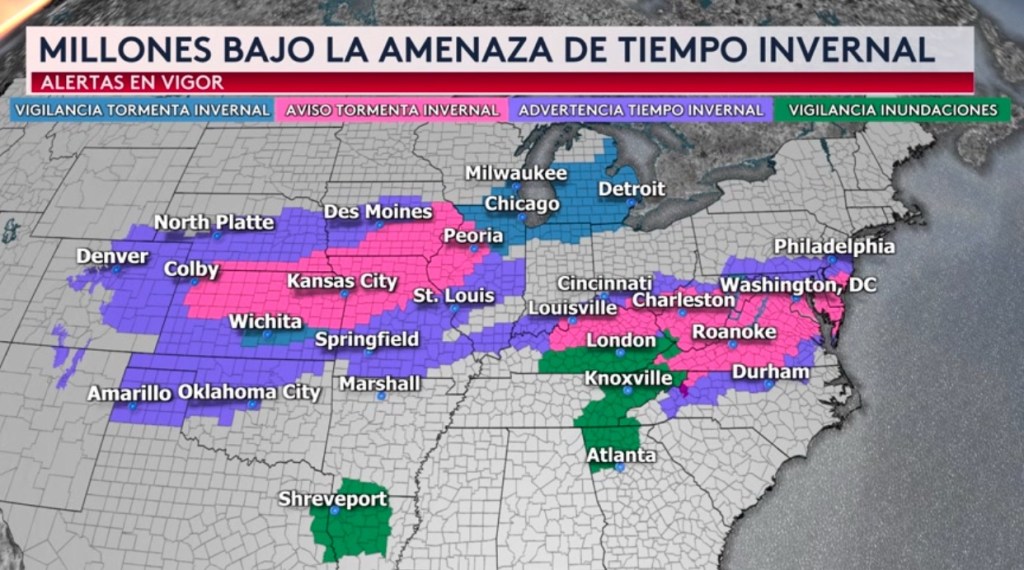 Ciudades bajo un aviso de tormenta invernal en el tono rosado son Kansas City en Missouri, Des Moines en Iowa, Peoria en Illinois, Louisville en Kentucky, Charleston en Virginia Occidental y nuestra capital del país Washington DC.