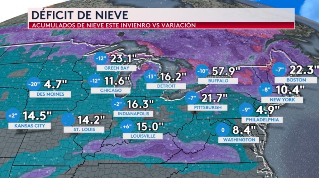 •Esta nieve será beneficiosa para gran parte del Medio Oeste, Grandes Lagos y noreste ya que muchas ciudades están experimentado déficits de nieve. Chicago, por ejemplo, solo ha recibido 11 pulgadas de nieve esta temporada invernal, representando un déficit de 12 pulgadas hasta la fecha. Chicago recibirá entre 3-6 pulgadas durante esta semana.